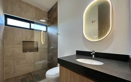Baños con mesetas de mármol, gavetas, canceles de cristal templado y espejos con iluminación LED